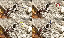 Die Wespen versuchen den Ameisen bei einem Angriff von hinten sowohl auf der ventralen als auch dorsalen Seite des Metasomas, seltener in dessen Apex, ihr Ei einzustechen. Von einer Beobachtung ist die Ablage auch in den Kopf einer Ameise dokumentiert. Da der Ovipositor durch die Wespen entsprechend der Längsachse des Metasomas eingeführt wird, ist davon auszugehen, dass die Wespen versuchen, dabei eine der Intersegmentalhäute zu treffen. Zum Erreichen dieses Ziels sind zwei Strategien der Wespen dokumentiert, die von der Flugrichtung des Angriffs und dem Grad der Neigung des Matasomas der Ameisen abhängt. Steht das Metasoma der Ameise (weitgehend) horizontal zum Untergrund, verfolgt die Wespe die Ameise und fliegt sie von hinten in Richtung ihrer Längsachse an. Sie streckt dabei ihre Vorderbeine nach vorne und berührt schließlich das Metasoma der Ameise mit ihren Tarsen auf der Dorsalseite. Durch diesen Griff schnellt die Wespe über das Metasoma der Ameise, setzt dabei ihre mittleren und hinteren Beine darauf ab und faltet ihre Flügel zusammen, bevor sie mit der Eiablage beginnt. Steht das Metasoma hingegen vertikal bzw. in einem Winkel von mehr als ca. 45° zum Untergrund, fliegt sie die Ameise zwar ebenso von hinten an, wobei sie dabei auch von der Längsachse der Ameise abweicht, greift mit ihren vorderen Tibien aber nach der Ventralseite des Matasomas der Ameise. Danach vollführt sie zwei Drehbewegungen, die abhängig von der Flugrichtung der Wespe und der Neigung des Metasomas der Ameise variieren. Wenn sich die Wespe im horizontalen Flug einem in die Höhe gestreckten Metasoma nähert, vollführt sie bei der Eiablage eine Pirouette. Nachdem sie das Metasoma mit den Vordertarsen berührt hat und sich damit senkrecht dazu befindet, beginnt sie mit einer Drehbewegung um 180° in ihrer Längsachse und dreht sich gleichzeitig in vertikaler Richtung, um sich dem Metasoma zu nähern. Durch diese doppelte Drehbewegung dreht sich die Wespe nach unten und kann den Ovipositor entsprechend der Längsrichtung des Metasomas der Ameise einstechen. Während des gesamten Vorgangs bleibt die Berührung der Vordertarsen mit dem Metasoma aufrecht. Um bei der Drehbewegung nicht den Kontakt zu verlieren, müssen die Tarsen etwas voneinander getrennt, ein Glied über dem anderen positioniert werden. Wenn das rechte Tarsenglied oberhalb des linken liegt, dreht sich die Wespe gegen den Uhrzeigersinn, ansonsten umgekehrt. Dadurch zeigt sich, dass die Platzierung der Tarsen in Längsrichtung des Metasomas die Drehbewegung unterstützt.[1]