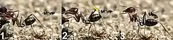 Das Einstechen des Ovipositors erfolgt immer nach dem gleichen Schema. Die Wespe greift das Metasoma der Ameise mit allen drei Beinpaaren und faltet ihre Flügel zusammen. Unmittelbar danach bewegt sich die Wespe sukzessive nach hinten, um ihren Körper senkrecht zum Metasoma der Ameise zu bewegen. Dabei verbleibt die Spitze ihres Metasomas über dem Metasoma der Ameise. Bei Lage des Metasomas der Ameise horizontal zum Untergrund, bewegt sich der Körper der Wespe nach hinten und richtet sich in vertikale Richtung. Bevor die Vertikale erreicht wird, bewegt sich die Spitze des Metasomas der Wespe nach unten, wobei vermutlich dabei die Eiablage stattfindet. Bei der Lage des Metasomas der Ameise vertikal zum Untergrund drückt die Wespe die Spitze ihres Metasomas auf das Metasoma der Ameise, bis sich die beiden Körperteile berühren. Die Wespe lehnt sich dabei weiter nach hinten, etwas über die Vertikale hinaus und fliegt schließlich nach hinten weg. Der Dorn am fünften Sternum dient vielleicht bei der extrem rasch verlaufenden Eiablage dazu, die Position der Wespe zu stabilisieren und die Bewegungen des Metasomas der Wespe zu Unterstützen.[1]