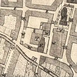 Das vierflügelige Kollegiengebäude im Ausschnitt des Göttingen-Stadtplans von Georg Daniel Heumann (1747): T = „das Auditorium publicum“, E = „Universitaets- oder Pauliner Kirche“, W = „die Professoren Häußer“. – Norden ist links.