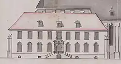 Kollegiengebäude Göttingen, Fassadenentwurf von Joseph Schädeler, 1733 (Niedersächsisches Landesarchiv Hannover, Signatur: Kartensammlung, Nr. 23 d Göttingen 27 pm). – Nordfassade, im Hintergrund die Universitätskirche.