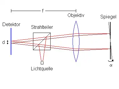 - Im Besonderen befindet sich in der vorderen Brennebene der Linse eine beleuchtete Mess-Skala (zum Beispiel eine Strichplatte), die mittels parallelem Strahlengang nach der Linse ins Unendliche (∞) abgebildet wird. Ein solches künstliches Ziel in unendlicher Entfernung eignet sich für Winkelmessungen, weil es unempfindlich gegen Parallelverschiebung des Kollimators ist.[1] Befindet sich die Mess-Skala in der Brennebene eines Fernrohr-Objektivs, entsteht ein Hilfsgerät zur Prüfung und Justierung optischer Instrumente. Die Verbindung eines Kollimators mit eigener Linse mit einem vorgesetzten Fernrohr erlaubt vielfältige Anwendungen bei messtechnischen Aufgaben, insbesondere bei Richtungs- und Winkelbestimmungen.[2] Ein spezieller Kollimator ist der Autokollimator (oder Autokollimationsfernrohr), bei dem das Licht vom drehbaren Messspiegel zu seinem Ausgangsort zurückgeworfen wird (siehe nebenstehende Abbildung). Die Empfindlichkeit bei der Richtungs- und Winkelbestimmung ist doppelt so groß wie bei der Kombination aus Kollimator und Fernrohr.[3]