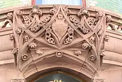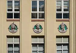 In den Brüstungen des zweiten Obergeschosses wurden Schmuckmedaillons aus Keramik eingefügt. Diese Schmuckmedaillons an der Bleichstraße 77 zeigen Relief-Tondi mit fünf figürlichen Reliefbüsten, die die fünf Erdteile symbolisieren: Afrika, Australien, Europa, Asien und Amerika.[1] Die Supraporte des Haupteingangs an der Bleichstraße 81 zeigt Formen der Gotik.[2]