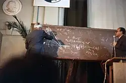 Kolmogorow führt seinen Vortrag an der Tafel aus. Rechts Akiwa Jaglom