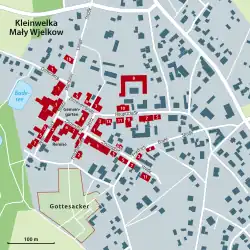 Um 1850, Kern womöglich älter | Das Rittergut wurde 1345 erstmals erwähnt. Anfang des 18. Jahrhunderts wechselte es häufig den Besitzer, zwischen 1701 und 1705 sind fünf Besitzerwechsel vermerkt. Der nichtadlige Verwalter Matthäus Lange kaufte 1746 das Gut, nachdem sich niemand vom Adel für es interessiert hatte. Lange stellte es 1751 den erweckten Sorben als ersten Versammlungsraum zur Verfügung. Der erste Prediger der Kleinwelkaer Gemeine, Wilhelm Biefer, wohnte in diesem Gut. Zwischen 1752 und 1758 zur Einweihung des Betsaals befand sich hier der Versammlungssaal.