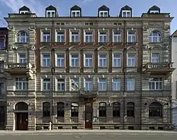 Das Gebäude wurde im Stil der Neorenaissance erbaut und ist ein viergeschossiger, traufständiger Satteldachbau mit flachen Seitenrisaliten. Die Fassade wird von Ziegelmauerwerk mit Sandsteingliederung geschmückt. Der Baukörper wird von einer Attika abgeschlossen. In den Seitenrisaliten sitzen im zweiten Obergeschoss von Konsolen getragene Austritte mit Steinbalustergeländer. Im ersten Obergeschoss über dem schmalen Eingang im Zentrum sitzt ein kleinerer Balkon mit schmiedeeisernem Ornamenteisengitter. Reicher Neorenaissanceschmuck begleitet die Fassade der Risalite.