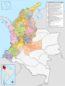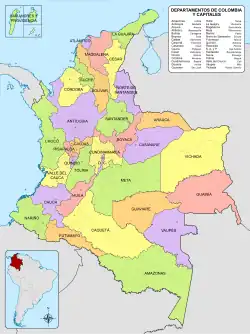Die Departamentos sind die Gebietseinheiten der ersten Ebene in Kolumbien. Das Land ist verwaltungstechnisch und politisch in 32 Departamentos unterteilt, die von ihren jeweiligen Hauptorten aus regiert werden. Die Departamentos bilden die natürlichen, geografischen, kulturellen und wirtschaftlichen Regionen Kolumbiens. Gemäß Artikel 298 der politischen Verfassung Kolumbiens von 1991 ist sie eine Gebietskörperschaft, die nach Maßgabe der Verfassung und der Gesetze über Autonomie bei der Verwaltung der sektoralen Angelegenheiten und der Planung und Förderung der wirtschaftlichen und sozialen Entwicklung in ihrem Gebiet verfügt.[1]