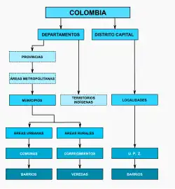 Alle Gemeinden sind entsprechend ihrer Bevölkerungsdichte in zwei Zonen eingeteilt: die urbane und die rurale Zone[5], aus denen sich wiederum verschiedene Arten von Gemeindebezirken ergeben. Die urbane Zone einer kolumbianischen Gemeinde entspricht der Gesamtheit der zusammenhängenden Gebäude und Strukturen, die in Blöcken gruppiert und durch Straßen, Wege oder Alleen abgegrenzt sind. Diese Gebiete sind in der Regel mit grundlegenden Dienstleistungen wie Wasser, Abwasser, Strom, Krankenhäusern, Schulen usw. versorgt. Zu dieser Kategorie gehören die Hauptorte der Departamentos und die übrigen Gemeindesitze.[5] Die rurale Zone einer Gemeinde ist durch die verstreute Anordnung von Wohnhäusern und Bauernhöfen gekennzeichnet. Es gibt keine Struktur oder Systematik von Straßen, Wegen, Alleen usw. Auch verfügt sie im Allgemeinen nicht über die öffentlichen Dienstleistungen und sonstigen Einrichtungen einer urbanen Zone.[5]