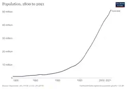 Kolumbien hatte 2022 51,9 Millionen Einwohner[13] und war damit der nach Brasilien bevölkerungsreichste Staat Südamerikas. Das jährliche Bevölkerungswachstum betrug + 0,7 %. Zum Bevölkerungswachstum trug ein Geburtenüberschuss (Geburtenziffer: 13,9 pro 1000 Einwohner[14] vs. Sterbeziffer: 7,4 pro 1000 Einwohner[15]) bei. Die Anzahl der Geburten pro Frau lag 2022 statistisch bei 1,7, die der Region Lateinamerika und die Karibik betrug 1,8.[16] Die Lebenserwartung der Einwohner Kolumbiens ab der Geburt lag 2022 bei 73,7 Jahren[17] (Frauen: 77,1[18], Männer: 70,3[19]). Der Median des Alters der Bevölkerung lag im Jahr 2021 bei 30,8 Jahren.[20] Im Jahr 2023 waren 21,1 Prozent der Bevölkerung unter 15 Jahre,[21] während der Anteil der über 64-Jährigen 9,4 Prozent der Bevölkerung betrug.[22] "