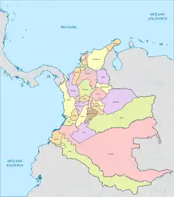 Kolumbien gliedert sich in sechs unterschiedliche Großräume.[6] Es sind die Región Caribe, die am Karibischen Meer anliegt, die Región insular, die die Inseln in der Karibik (San Andrés und Providencia) und im Pazifischen Ozean (Malpelo und Gorgona) umfasst, die Región del Pacífico, die an den Pazifischen Ozean grenzt, die Región Andina (Andenregion) mit den Anden, dominiert von der Zentralkordillere, die Región de la Orinoquía, einem Teil der Llanos-Ebenen, hauptsächlich im Flussgebiet des Río Orinoco entlang der Grenze zu Venezuela und die Región Amazónica mit dem Amazonas-Regenwald.