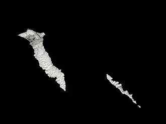Echtfarben-Satellitenbild der Kommandeurinseln (Terra MODIS, 3. Mai 2005), links die Beringinsel, rechts Medny (die „Kupferinsel“)