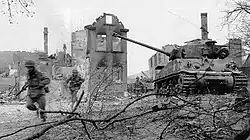 Soldaten der Task Force Baum rennen bei ihrem Durchbruch an einem zerstörten Sherman-Panzer in Aschaffenburg vorbei.