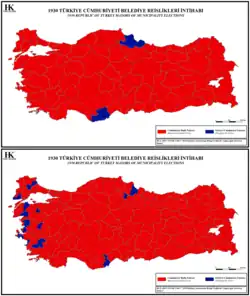 An der Wahl, bei der erstmals Frauen das aktive Wahlrecht zugestanden wurde,[1] nahmen die Republikanische Volkspartei (CHF, heute CHP) des Staatspräsidenten Atatürk und die oppositionelle Freie Republikanische Partei (SCF) unter dem Vorsitzenden Fethi Okyar (damals noch als Ali Fethi Bey) teil. Die SCF gewann bei den Wahlen im Oktober 1930 in 30 von 512 Gemeinden, wurde jedoch wenig später am 17. November 1930 wieder aufgelöst.[2]