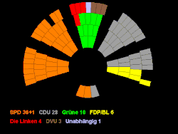 | Die Linke hieß 2004 noch PDS-OL. Wahlperiode 1999–2004: Ein RM (Ratsmitglied) wechselte von der Bürgerliste zur Schillpartei bzw. Offensive D. Wahlperiode 2004–2009: Ein RM wechselte von der CDU zur FDP. Ein RM wechselte von der Bürgerliste zur FDP. Ein RM wechselte von der Bürgerliste zur Partei Die Linke. Ein RM wechselte von der DVU zur NPD. Ein RM wechselte von der Offensive D und gründete die FBI. | ||||||||||||||||||||||||