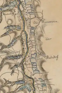 In der Beschreibung Teschener Schlesiens von Reginald Kneifl im Jahr 1804 hatte Batzdorf (polnisch Komorowice) in den fürstenlichen Kammergütter zur Stadtkirche in Bielitz eingepfarrtes Dorf 29 Häuser mit 241 Einwohnern, die nur Deutsch sprachen, während das Mückendorf (polnisch Komorowice) im Besitztum des Grafs Andreas Renard von Czechowice 19 Häuser mit 76 Einwohnern hatte, die nur Schlesisch-Polnisch sprachen.[15]