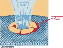 Die beiden Produkte der C5-Spaltung fungieren einerseits als Anaphylatoxin und chemotaktischer Lockstoff (C5a) und andererseits leiten sie auch die Bildung des Membranangriffskomplexes (MAC) ein (C5b). Dabei rekrutiert der „Anker“ C5b nacheinander die Faktoren C6, C7 und C8. Der entstandene C5b678-Komplex startet dann die Polymerisierung von C9. Nach der Zusammenlagerung von bis zu 18 C9-Monomeren stellt der C5b678poly9-Komplex den fertigen Membranangriffskomplex dar, der die Zielzelle unter anderem durch Porenbildung in der Zellmembran attackiert und zu ihrer Lyse führt.[5] Die löslichen Komplementfragmente C3a, C4a und C5a lösen eine lokale Entzündungsreaktion aus. Sie führen durch Bindung an Komplementrezeptoren der basophilen Granulozyten zu derer Freisetzung von Histamin, Heparin und Leukotrienen. Die Aktivierung von Komplementrezeptoren an Endothelzellen, glatten Muskelzellen, Monozyten, Eosinophile, und Mastzellen führt zur Bronchokonstriktion, Vasodilatation, Erhöhung der Gefäßpermeabilität und Rekrutierung (durch C5a) von Granulocyten und Monocyten an Gefäßwände, was die Voraussetzung für deren Einwanderung in das Entzündungsgebiet darstellt. C3a fördert dabei vorwiegend Gewebereparatur-Mechanismen. C5a stimuliert die Entzündungsreaktion. Damit bilden die Anaphylatoxine ein wichtiges Bindeglied zwischen angeborener und adaptiver Immunabwehr.