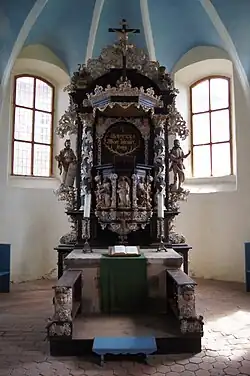 Das Hauptstück der Ausstattung ist ein aus der Grundform einer Ädikula entwickelter Kanzelaltar aus der Zeit um 1710, dessen vorgestellte Säulen mit Laubwerk dekoriert sind. Das von Pilastern flankierte Gehäuse schließt mit einem Segmentbogen ab. Seitwärts sind die Figuren von Mose und Johannes des Täufers aufgestellt. Das Rahmenwerk und die Altarbekrönung sind ebenfalls aus Akanthus gestaltet, mit den Familienwappen derer von Schlieben und von Wolff. Am polygonalen, durch Laubwerkspfeiler gegliederten Kanzelkorb sind die Figuren von Christus und der vier Evangelisten angeordnet. Auf dem Schalldeckel steht ein Kruzifix. Ein schwebender Taufengel wurde 1730 angefertigt.