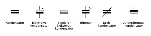 Ein Kondensator (von lateinisch condensare ‚verdichten‘) ist ein passives elektrisches Bauelement mit der Fähigkeit, in einem Gleichstromkreis elektrische Ladung und die damit zusammenhängende Energie statisch in einem elektrischen Feld zu speichern. Die gespeicherte Ladung pro Spannung wird als elektrische Kapazität bezeichnet und in der Einheit Farad gemessen. In einem Wechselstromkreis wirkt ein Kondensator als Wechselstromwiderstand mit einem frequenzabhängigen Impedanzwert.