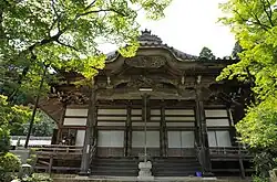 Man durchquert das Tempeltor (山門, Sanmon; 1 im Plan), das hier als Turmtor mit den Figuren der beiden Tempelwächter (仁王, Niō) rechts und links vom Durchgang aus geführt ist. Das Tor wurde 1932 errichtet, die Tempelwächter stammen aus dem alten Tor. Voraus hat man dann die Haupthalle (本堂, Hondō; 2) aus dem Jahr 1912 vor sich. Zu den weiteren Gebäuden gehört der Glockenturm (鐘楼, Shōrō; 3) und die Amida-Halle (阿弥陀堂, Amidadō; 4).