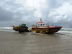 Die KNRM bietet mit speziellen Küstenrettungsfahrzeugen auch eine Unterstützung an Land. Die Rettungsstationen an der Nordseeküste übernehmen mit diesen KHV-Lastwagen (KHV Kusthulpverlening) den Transport der leichten Strandrettungsboote und unterstützen die Suche an Land im Rahmen der SAR-Aufgaben. Auch bei Einsätzen von Polizei und Feuerwehr sind die KHV-LKW Bestandteil der Rettungskette. Normalerweise übernimmt die KNRM damit den Transport von Unfallopfern im Strand- und Dünenbereich, da die Fahrzeuge auch in schwer zugänglichem Gelände agieren können.[6]