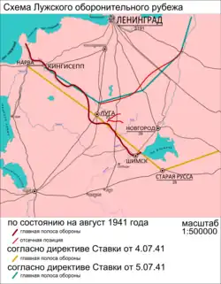 Als sich ein deutscher Durchbruch südlich des Peipus-Sees abzeichnete, wurden die Truppen der neuen Verteidigungslinie am 6. Juli zur Operationsgruppe Luga unter Pjadyschews Befehl zusammengefasst. Diese umfasste sechs Schützendivisionen, drei Miliz-Divisionen und eine Gebirgsschützen-Brigade, welche bis zum 9. Juli in Stellung gingen.[4] Mit diesen Truppen sollte Pjadyschew eine etwa 300 km lange Linie halten, die erst seit dem 29. Juni hektisch ausgebaut worden war. „K.P. Pjadyschew, ein glänzender, sehr kritisch eingestellter Offizier, der über reiche militärische Erfahrungen verfügte und sich kaum Illusionen machte. Wie jedermann wusste auch er, dass Leningrad keine ausgebildeten Truppen mehr stellen konnte, die man in die entstandene Lücke hätte werfen können.“[5] Es gelang ihm eine halbwegs tragfähige Verteidigung aufzubauen und vom 14. bis zum 18. Juli 1941 waren seine Verbände an einer ersten Gegenoffensive im Raum Solzy beteiligt (→ Schlacht bei Solzy). Trotz einiger Anfangserfolge erlitt die Rote Armee hier letztlich eine verlustreiche Niederlage.[6]