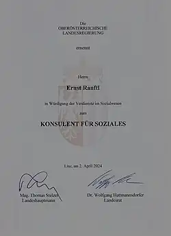 Verleihungsurkunde zum Konsulententitel in Oberösterreich