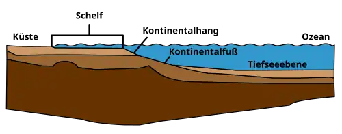 Zum Kontinentalrand gehören Kontinentalschelf, Kontinentalhang und Kontinentalfuß. Er bildet den Übergang zum Tiefseebecken.