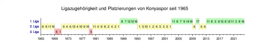 Konyaspor ist ein türkischer Fußballverein aus der zentralanatolischen Stadt Konya und spielt derzeit in der Süper Lig,[1] der höchsten türkischen Spielklasse.[2] Der Verein spielte in den 1980er, 1990er und 2000er Jahren insgesamt 17 Spielzeiten in der Süper Lig und befindet sich in der Ewigen Tabelle der Süper Lig auf dem 19. Platz.[3] Seine erfolgreichste Erstligasaison hatte der Verein in der Saison 2015/16, in der der Klub den dritten Tabellenplatz erreichte. Als weitere wichtige Erfolge sind der Pokalsieg in der Spielzeit 2016/17 und der Supercup-Sieg 2017 hervorzuheben.[2]