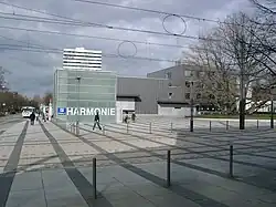 Die farbig verglaste Rasterwand des Foyers wurde entfernt und mit einer Glaswand versehen. Dem Foyer vorgelagert wurde eine Terrasse, die auf einem Podest errichtet wurde und über eine Treppe zu erreichen ist. Die Terrasse, die Treppen und das Foyer werden abends akzentvoll beleuchtet, erhalten dadurch eine Bühnenwirkung und laden derart zum Besuch der Harmonie ein.