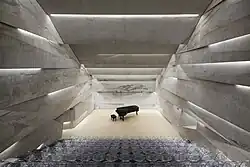 Der Konzertsaal bietet Platz für 200 Zuhörer, und auf der Bühne können bis zu 60 Musiker spielen. Die Innengestaltung ist geprägt durch hellen Glasbeton (auskragende Elemente), der für eine exzellente Akustik sorgt. Im Untergeschoss sind unter dem Platz der neuen Ortsmitte die Nebenräume angeordnet. Tiefenabsorber und Beleuchtung sind in den Wandschlitzen und unter den Stuhlreihen angebracht.
