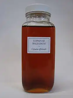 Kopaivabalsam oder Copaivabalsam, auch Jesuiterbalsam (lateinisch Balsamum Copaivae), auch „Copaiba-Öl“[1] und „Copahu“[2] genannt, war ein Balsam des Drogistikhandels (etwa von William Cullen und Benjamin Bell zum inneren Gebrauch empfohlen[3]) des 18. und 19. Jahrhunderts. Er stammt von verschiedenen Arten der Gattung Copaifera, hauptsächlich C. officinalis, C. coriacea und C. guyanensis,[4] die ihre Heimat in Südamerika und auf den Westindischen Inseln haben, sowie von Daniellia oliveri, Daniellia thurifera (Afrikanischer Kobaivabalsambaum, auch als Illurinbalsam) und auch von Sindora spp. (Sindora wallichii), Eperua spp. (Eperua oleifera).[5] Ein ähnlicher Balsam, der Hardwickiabalsam stammt von Prioria pinnata (Syn.: Kingiodendron pinnatum) und Hardwickia binata.