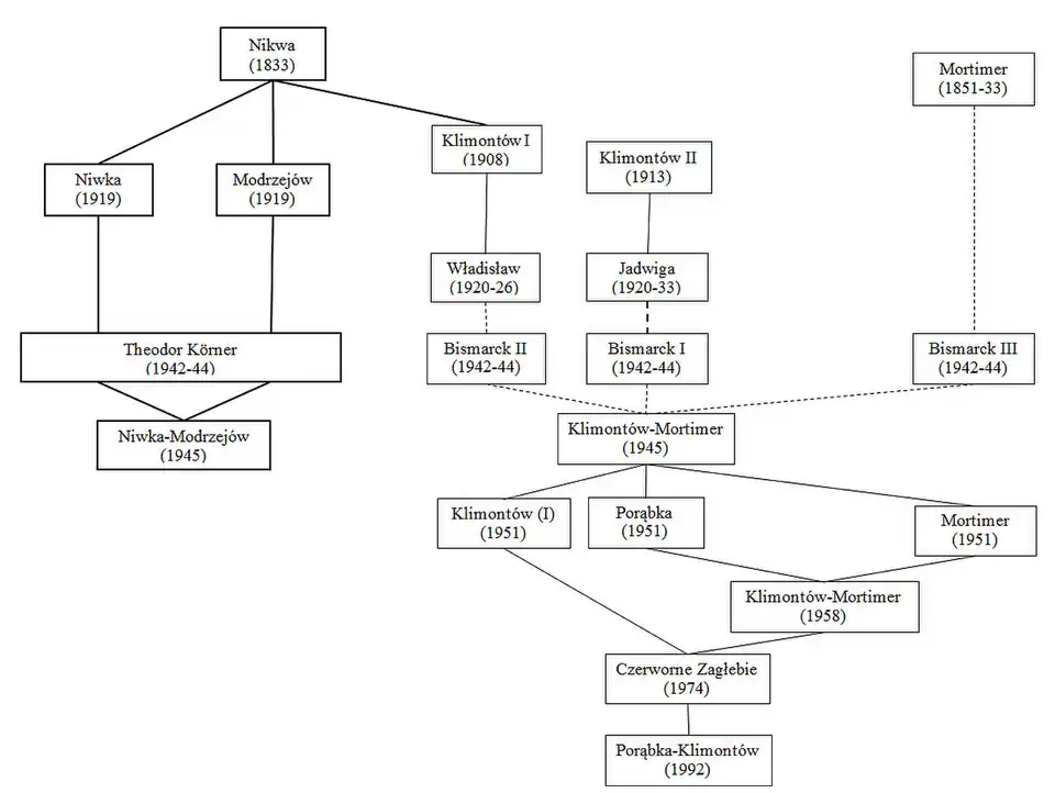 Sowohl das Blatt Birkental der TOP 25.000 von 1931 als auch statistische Daten aus den Jahren 1901–1904 weisen ein Bergwerk Barbara südlich von Klimontów als Teil von Niwka auf.