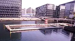 Das Hafenbad Islands Brygge Koordinaten: 56° N, 13° O verfügt über insgesamt 5 Becken und bietet Platz für 600 Personen. Es ist 7 Meter tief. Es gibt zwei Becken für Kinder, zwei 50-Meter-Becken zum Schwimmen und ein Sprungbecken mit Drei- und Fünf-Meter-Sprungbrettern.[2] Das Projekt wurde 2003 von JDS Architects und der Bjarke Ingels Group fertig gestellt.[6]