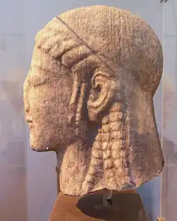 Der Kopf ist an vielen Stellen nicht mehr gut erhalten. Kinn und Nase sind gebrochen und fehlen zum Teil. Das Haar wird mit einem Band zusammengehalten. Es ist in lockigen Wellen gestaltet und wird sich nach unten hin verbreiternd hinter den Schultern entlang zum Rücken geführt. Auf die Brust wird auf jeder Seite eine einzelne Lockenwelle geführt. Auf der Oberseite und der Rückseite des Kopfes ist das Haar nicht ausgearbeitet. Zwei dünne Strähnen hängen vor den Ohren über die Schläfen. Der Gesichtsausdruck ist zurückhaltend, das Gesicht lang und schmal. Die großen Augen stechen trotz der schlechten Erhaltung hervor, die Lippen hingegen sind schmal.
