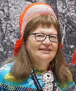 Frauenhaube der Skoltsámi, die unter einem Kopftuch getragen wird.