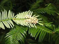 Die männlichen Blüten von Cephalotaxus harringtonia var. nana auf der Zweigunterseite