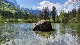 Der See, eigentlich eine Lacke (Tümpel), inmitten von Auwald gelegen, ist etwa 200 Meter lang und durch Buchten, sowie eine größere und mehrere kleinere Inseln gegliedert. Die Wassertiefe beträgt maximal einen halben Meter.[1] Die Wasserzufuhr erfolgt ausschließlich unterirdisch. Das Wasser stammt vom 840 km² großen Dachsteinplateau, in dem es durch Ponoren versickert und erst von der wasserundurchlässigen Gesteinsschicht durch die Schotterschicht in den See gedrückt wird.[2]