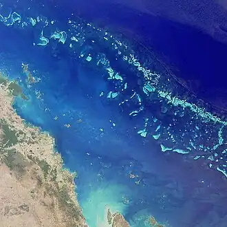 Das größte und bekannteste Barriereriff ist das Great Barrier Reef entlang der australischen Nordostküste.[11] Weitere große Barriereriffe sind das Belize Barrier Reef und das Neukaledonische Barriereriff.