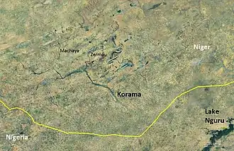 ![]() Satellitenaufnahme der Grenzregion zwischen Niger und Nigeria mit der Korama | ||