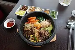 - Bibimbap (비빔밥) – Reis mit Gemüse und Ei, oft auch weiteren Zutaten