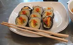 - Gimbap (김밥) – Reis mit Gemüse und Omelettstreifen in Seetang gerollt, typischer Imbiss