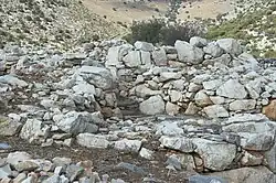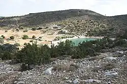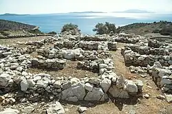 Mit Ausnahme einiger Steinplatten, die als Gefäßdeckel dienten, waren die kleinen Räume ohne weitere Funde. Dagegen entdeckte man inmitten ausgedehnter Brandspuren im Eingangsbereich und in den Gassen intakte Gefäße und Gruppen von zusammenpassenden Scherben. Die große Anzahl von Meereskieseln sowie eine einzelne Lanzenspitze am Eingang lassen die Zerstörung der Siedlung durch einen feindlichen Angriff vermuten.[12]