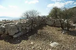 Oberflächenfunde von Keramik und Steinwerkzeuge geben Hinweise auf eine nahe gelegene Siedlung an den Hängen des Hügels. Sehr wahrscheinlich ist, dass diese Menschen Korfari ton Amygdalion als Fluchtplatz nutzten.[27] In Zeiten von Gefahr wäre die Festung auf dem Gipfel ein Zufluchtsort gewesen. Der überwiegend aufgefundene Keramikanteil gehörte zu großen Vorratsgefäßen. Offensichtlich schützte die Befestigung nicht nur die Bewohner der Siedlung, sondern auch Wasser- und Nahrungsvorräte, die für das Überleben der Gemeinschaft auch im Belagerungsfall von entscheidender Bedeutung waren. Wie Daskalio diente Korfari ton Amygdalion wohl als Fluchtplatz der nah gelegenen Siedlung, im Gegensatz zu Kastri, Kynthos und Markiani, die dauerhaft besiedelte befestigte Dörfer darstellten.[28] Bereits 1899 hatte Tsountas vorgeschlagen, dass Kastri auf Syros ein Zufluchtsort für die Bewohner eines nahe gelegenen Siedlungsplatzes war, dem er auch die Gräber der Nekropole von Chalandriani zuschrieb.[29] Die Erkenntnisse aus Korfari ton Amygdalion und Kastri legen nahe, dass die befestigten Plätze keine architektonisch eigenständigen Einheiten waren und ihre Existenz eng mit benachbarten Siedlungen verbunden war.[30]