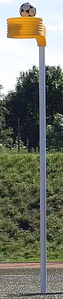 - Die Körbe befinden sich im Gegensatz zum Basketball nicht am Ende des Spielfeldes, sondern ein Sechstel der Spielfeldlänge im Feld. Außerdem hängen sie höher (3,5 m) und sind nicht mit einem Brett hinter dem Korb ausgestattet. Es kann also von allen Seiten geworfen werden.