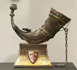 Das Horn – eine „Greifenklaue“ – ist ein braungraues, mit Goldschmiedearbeiten eingefasstes Büffelhorn, wie es in adligen Kreisen als Trinkgefäß oder als Jagdhorn diente.