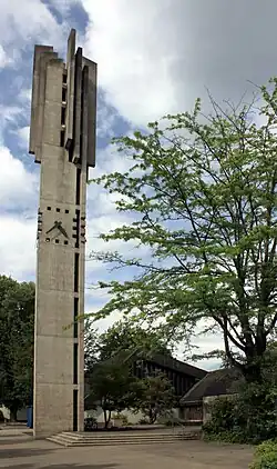 Der schlanke, 36 m hoch aufragende Kirchturm aus Sichtbeton auf quadratischem Grundriss steht völlig frei auf einem Platz vor dem Hauptzugang der Kirche, fast direkt an der Kreuzung Vierjuchartenweg/Kornfeldstrasse. Im oberen Drittel trägt der Turm über dem quadratischen, durch Aussparungen im Beton gestalteten Zifferblatt der Turmuhr einen kronenartigen Aufbau aus auf jeder Seite mehreren, vertikal orientierten, parallel zueinander angeordneten, etwas aus der Wand vorkragenden und an der Oberkante abgeschrägten Betonlamellen. An jeder Seitenwand des Turms läuft ein senkrechter Spalt über die gesamte Turmhöhe durch den Beton. Diese starke vertikale Gliederung verleiht dem Turm insgesamt eine gewisse – beabsichtigte – Ähnlichkeit mit einem riesigen Getreidehalm samt Ähre.