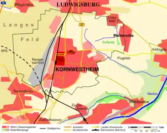 - ↑ Statistisches Landesamt, Fläche seit 1988 nach tatsächlicher Nutzung für Kornwestheim.