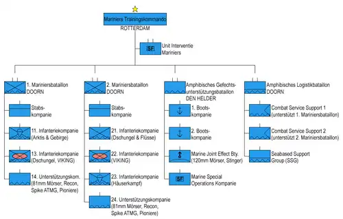 Das Korps Mariniers wird vom Mariniers Trainingskommando (Mariniers Trainings Commando oder MTC) mit Hauptquartier in Rotterdam geführt. Das MTC ist der Nachfolger des Führungskommandos der operativen Einheiten der Mariniers (Groep Operationele Eenheden Mariniers oder GOEM) und führt heute vier Bataillone. Es ist für die Führung und Ausbildung der unterstellten Einheiten zuständig und untersteht dem Kommandeur der Niederländischen Marine (Commandant NLMARFOR). Im Einsatzfall würden die Mariniersbataillone von den zwei Dock-Landungsschiffen der Rotterdam-Klasse an den Einsatzort transportiert und dort angelandet. Das 3. Mariniersbataillon besteht heute aus zwei Kompanien, welche auf den Niederländischen Antillen stationiert sind und unterstehen direkt dem Marine-Kommandeur Karibik. Dem MTC unterstehen zurzeit folgende Einheiten: