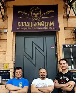Das Kosakenhaus ist eines der Verwaltungszentren von Asow (ukrainisch Азов), einer der ukrainischen rechtsextremen Gruppierungen. Vor der Revolution diente das Kosakenhaus als Unterkunft für Militärangehörige, doch als die Kämpfe auf dem Platz begannen, übernahm Asow die Kontrolle und verwandelte das Gebäude in ein Rekrutierungszentrum, ein Feldlazarett und eine Leichenhalle. Asow mietet das Gebäude vom Verteidigungsministerium[1]. In den grauen, neoklassizistischen Korridoren des Gebäudes stehen Schreine für die Gefallenen der Gruppe sowie Hochglanzbroschüren, die für ihre vom Kulturministerium finanzierten Sommerlager werben, in denen Kinder patriotische Erziehung und Waffentraining erhalten.[2]