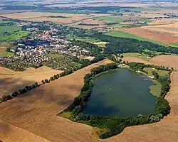 Am nordöstlichen Ufer des Sees wurde 1938 eine Badeanstalt aufgebaut. Ein Garderoben- und Umkleidehaus wurde aufgebaut, das später noch mit zwei Flügeln mit Umkleidekabinen versehen wurde. In der Mitte war die Garderobenabgabe, vorne war das Büro des Bademeisters. Attraktion aber war der Seesteg mit dem hölzernen Sprungturm.
