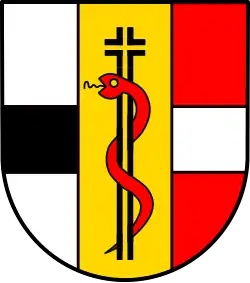 Blasonierung: „Schild zweimal gespalten, vorne in Silber ein schwarzer Balken, hinten in Rot ein silberner Balken, in der Mitte in Gold ein senkrecht und waagerecht getrenntes schwarzes Hochkreuz mit roter Schlange.“[15] |